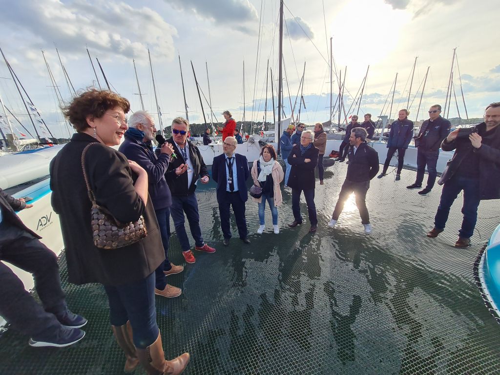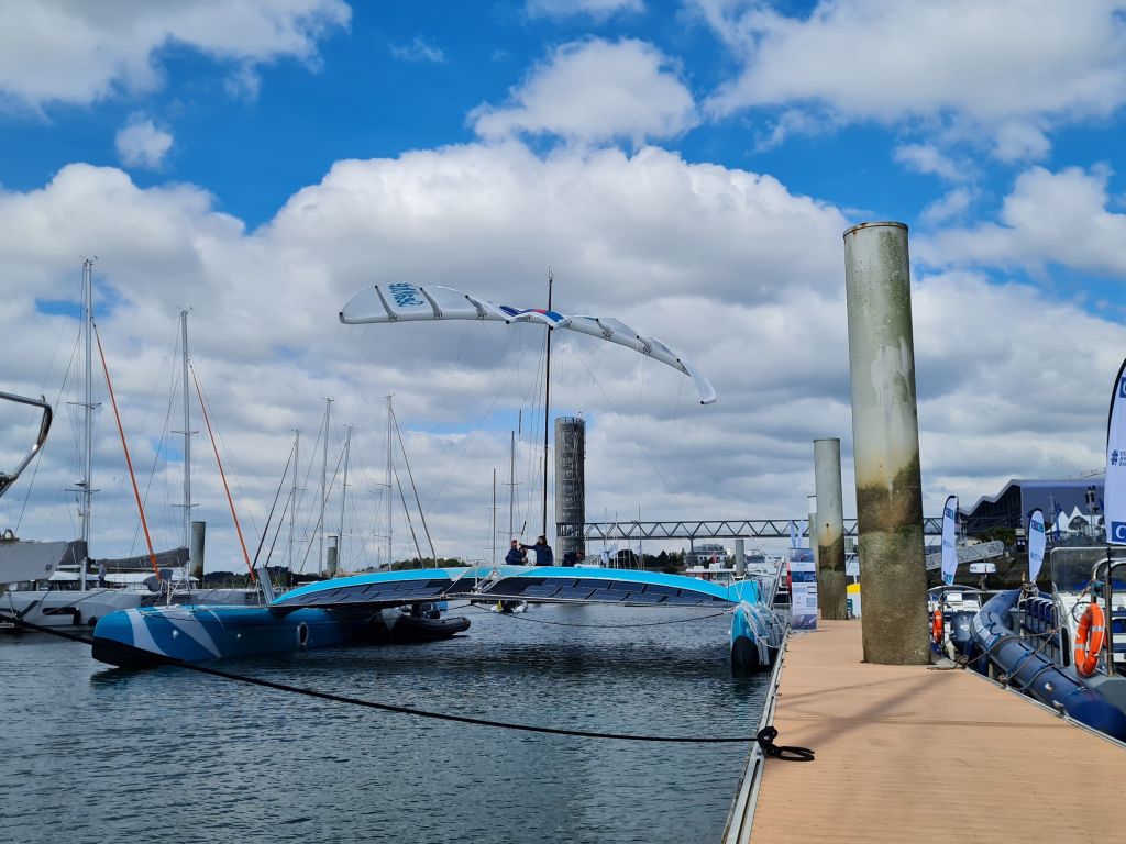 Une dizaine de nœuds soufflent sur la rade de Lorient arrosée par quelques grains. Tout juste assez de vent pour tester le système d’aile SeaKite de Beyond the Sea. La société de la Teste-de-Buch (Gironde), portée par l’ancien coureur au large Yves Parlier, a rallié en avril le port morbihannais avec son catamaran, l’ex-Hydraplaneur, rebaptisé également SeaKite, qui lui sert depuis novembre 2022 à tester ses ailes de traction. La start-up profite du départ de la course au large The Transat CIC et de la tenue du salon Navexpo pour présenter son système d’aile de traction destinée à décarboner la propulsion des navires. Entre ces deux événements, des représentants d’armements, d’équipementiers, de cabinets d’architecture ou encore de chantiers navals, saisissent l’occasion pour embarquer et assister à une démonstration.